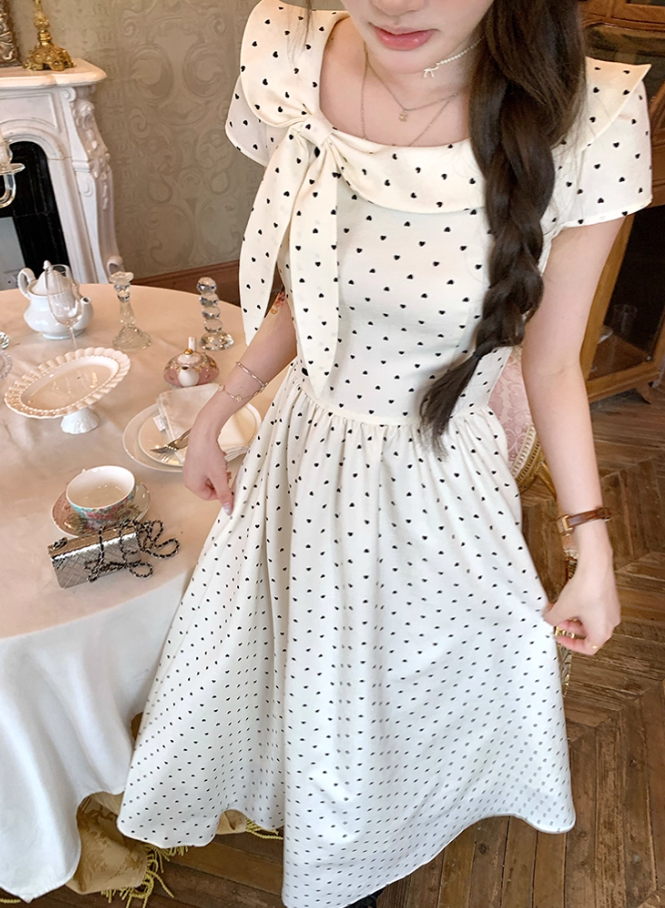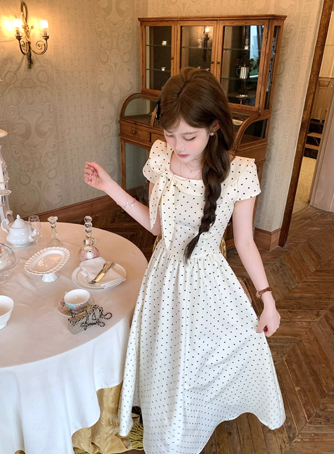 Long waist polka dot short-sleeved dress for women summer French retro temperament skirt R4626