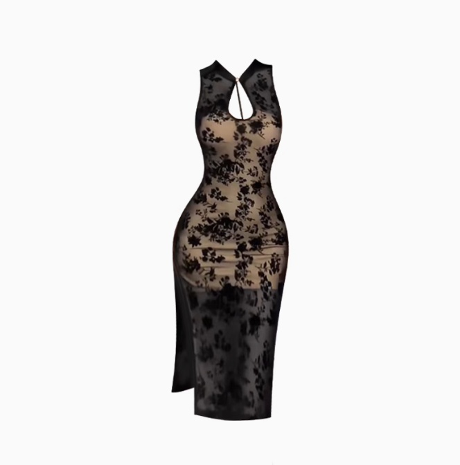 New Chinese hollow sleeveless dress 2025 waist hip slit long skirt R1363