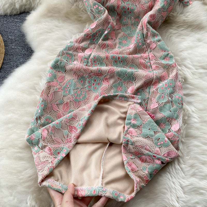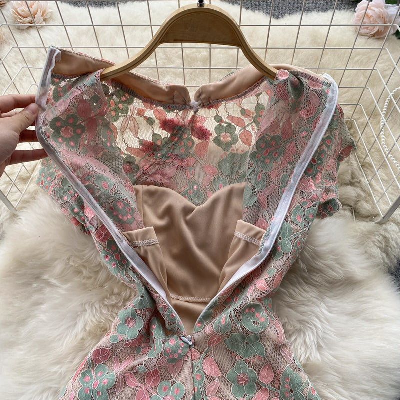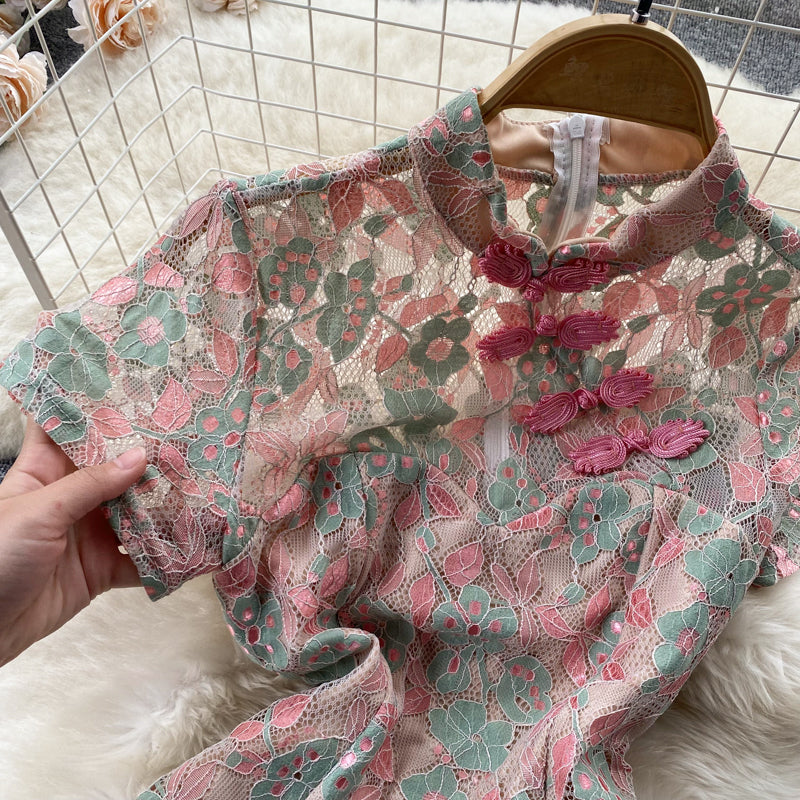 New retro embroidery print improved girl dress short sleeve slit hip cheongsam R2287