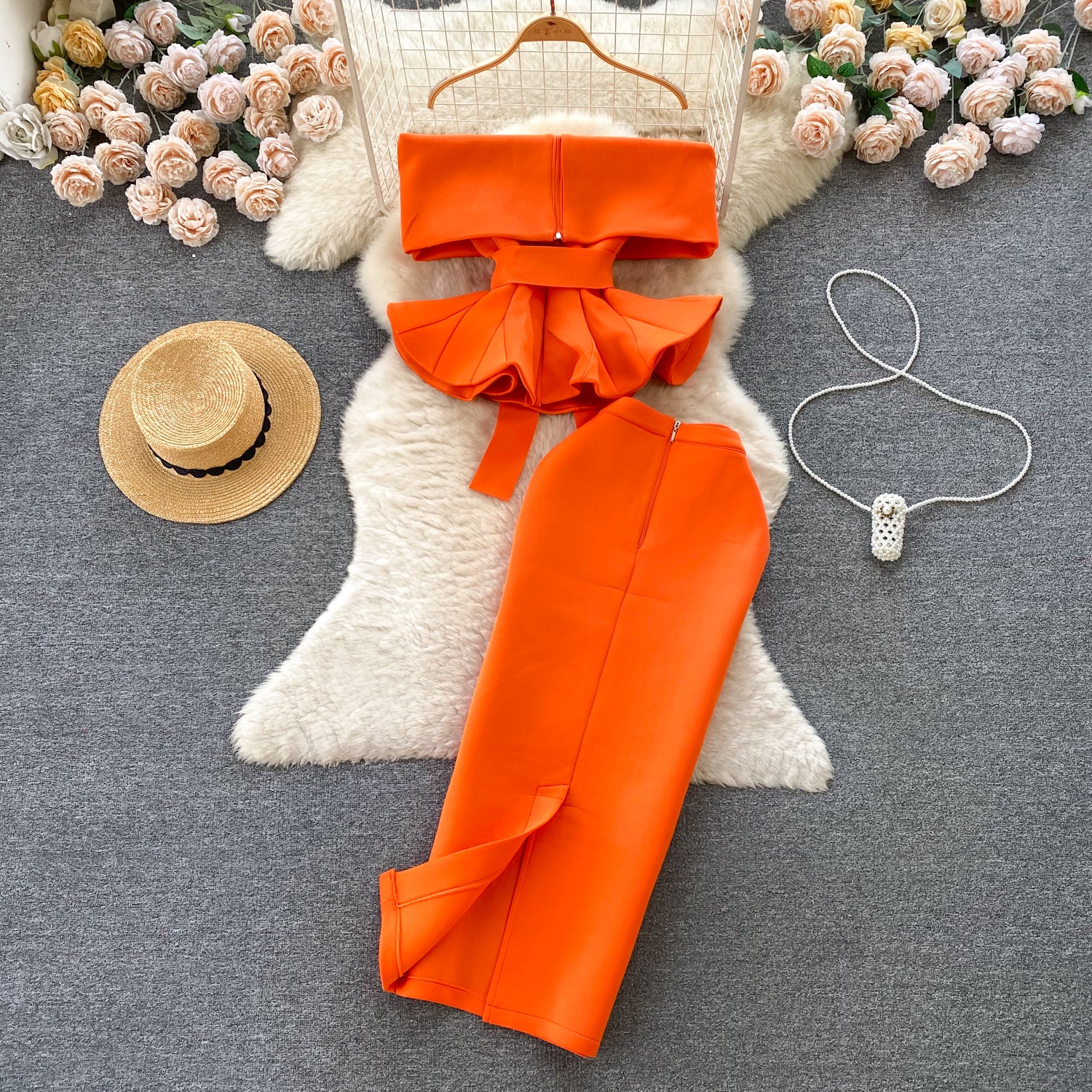 Palace style dress suit sexy one shoulder waist lotus leaf hem top versatile skirt two piece suit R2251