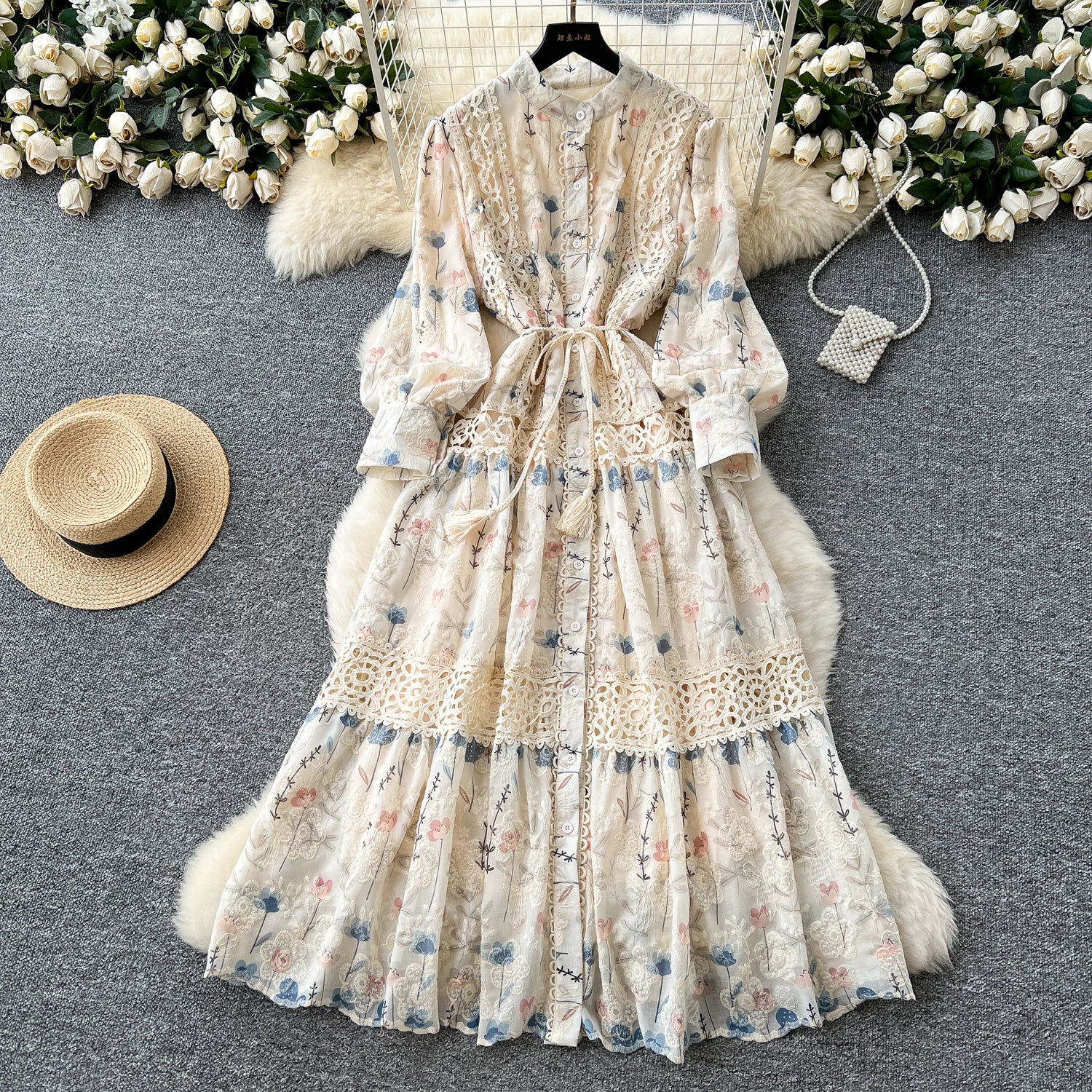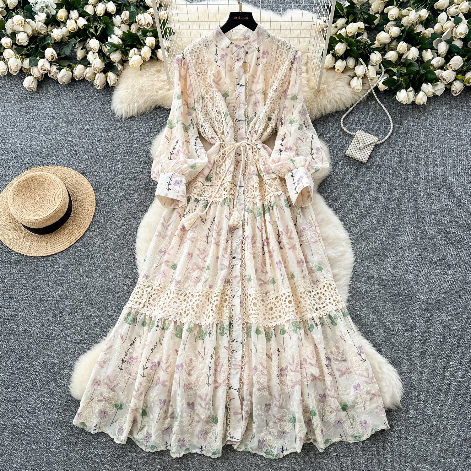 Palace style lace patchwork waist dress French slim print embroidered fairy long dress R2244