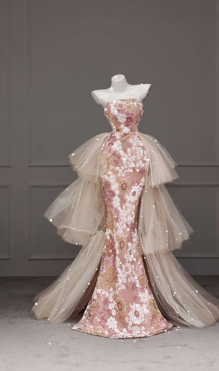 Pink floral tube top sexy dress with waist and hips, prom dress R5291