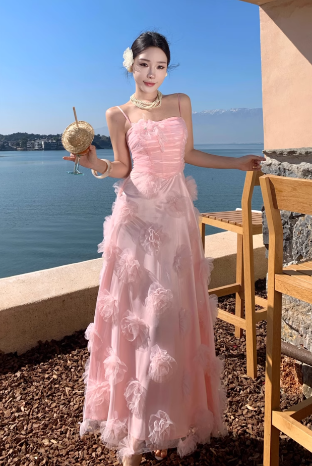 Pink flower suspender dress gentle temperament beautiful dress R0800