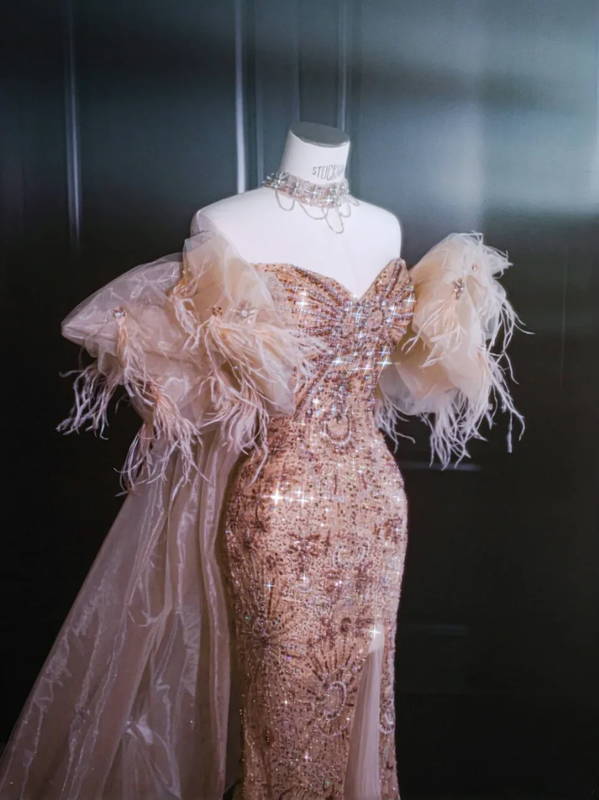 Pink tube-top sequined slim-waisted fishtail maxi dress, prom dress R5656