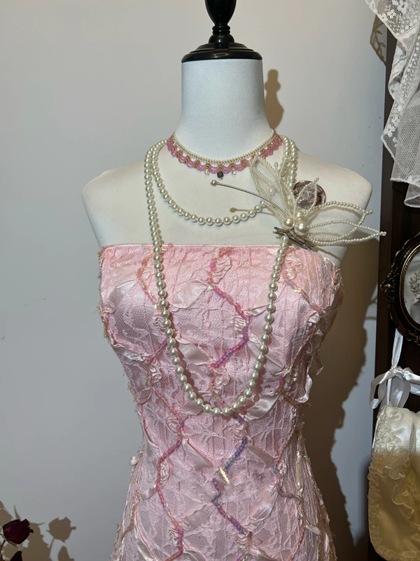 Pink tube top slim waist fishtail pleated skirt long dress homecoming dress R4251