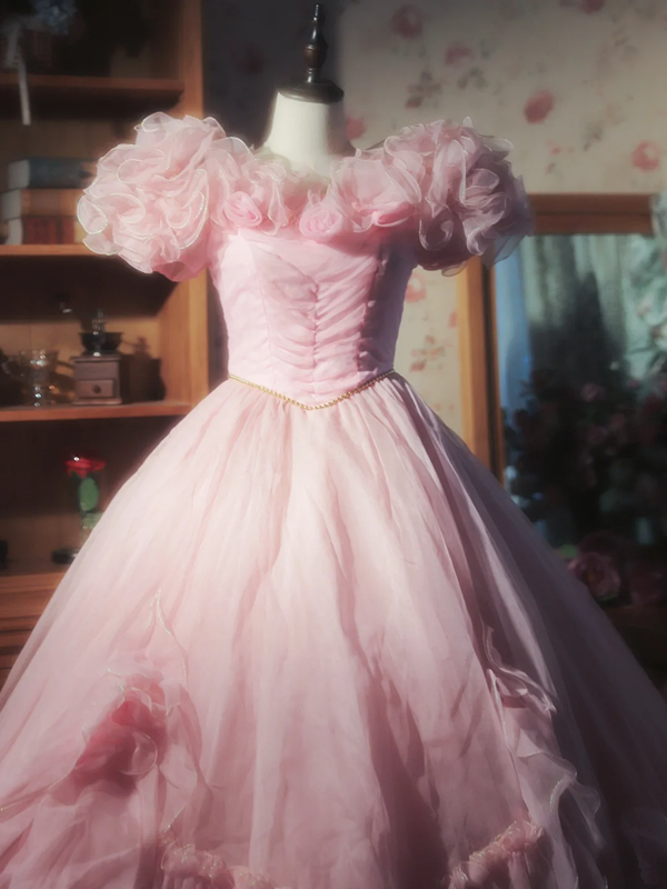 Pink vintage ball gown with a cinched waist, slim fit and voluminous puffy skirt; bridal gown R7286
