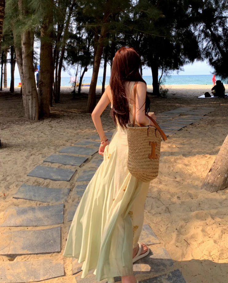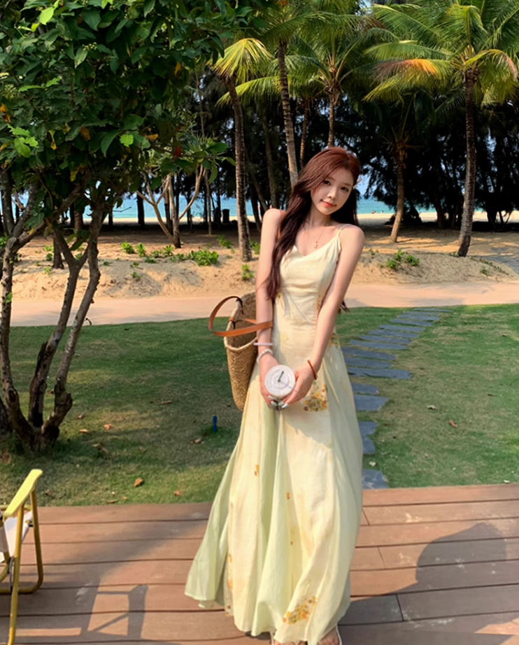 Printed suspender dress Chinese style women's clothing small size big swing v-neck long dress R1708