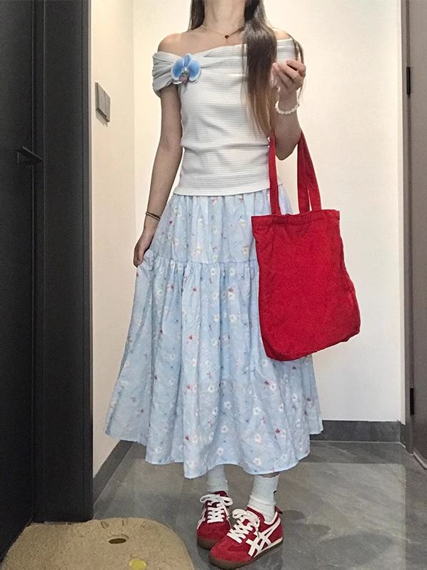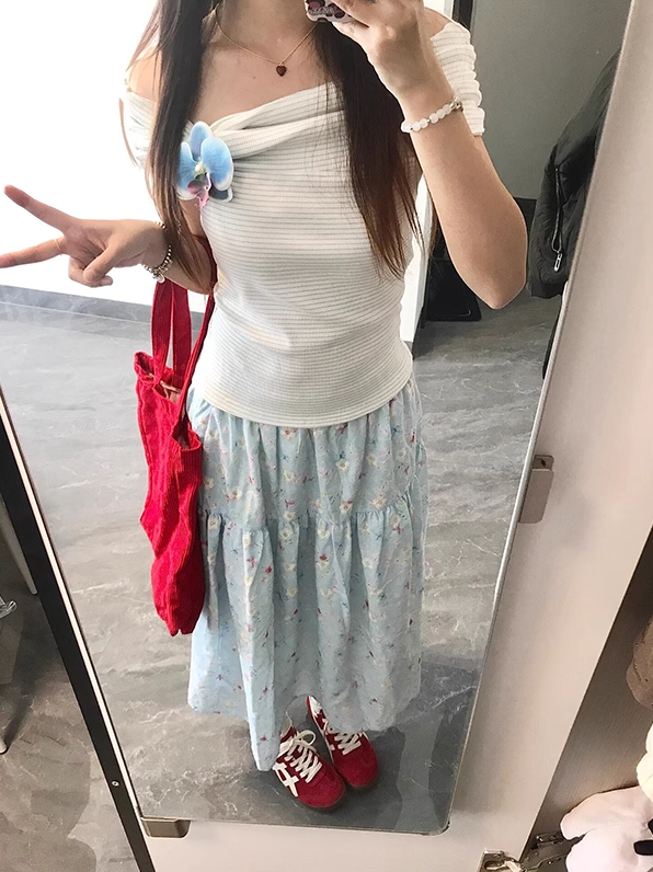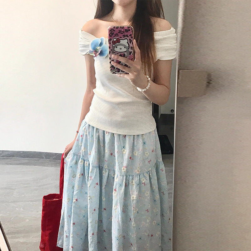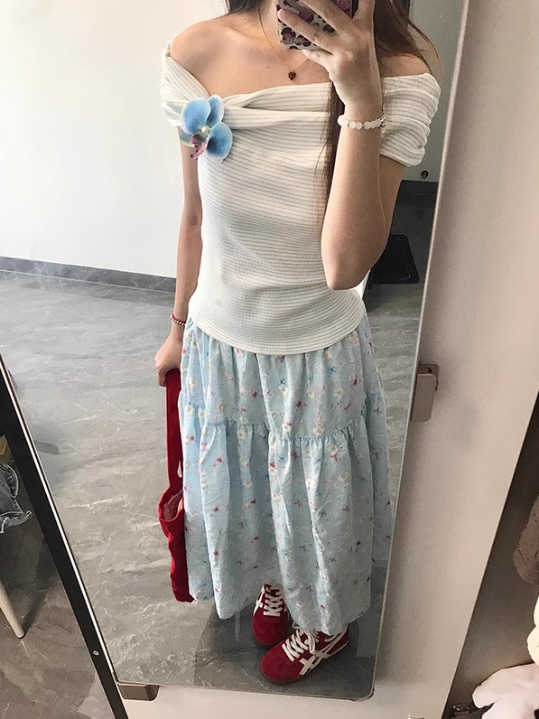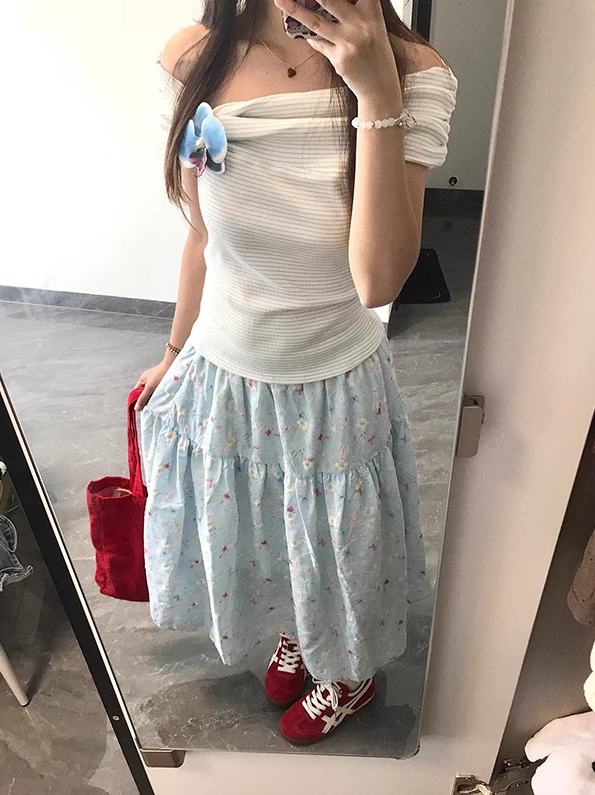 Pure and gentle holiday style striped one-shoulder T-shirt floral skirt two-piece suit R0876