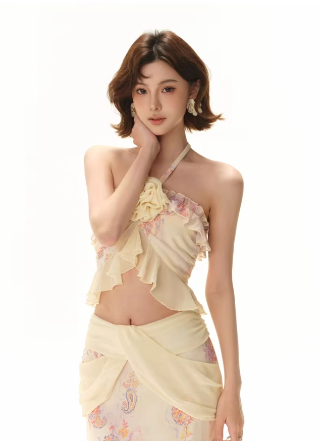 Pure desire ruffled flower halter neck top 2025 hip holiday maxi dress suit R1339