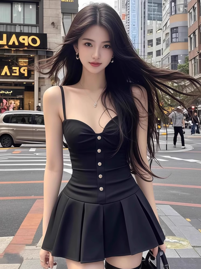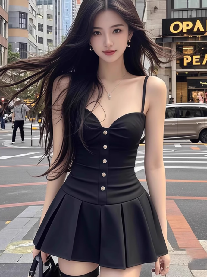 Pure desire style sexy black suspender dress new style waist slimming A-line short skirt R3393