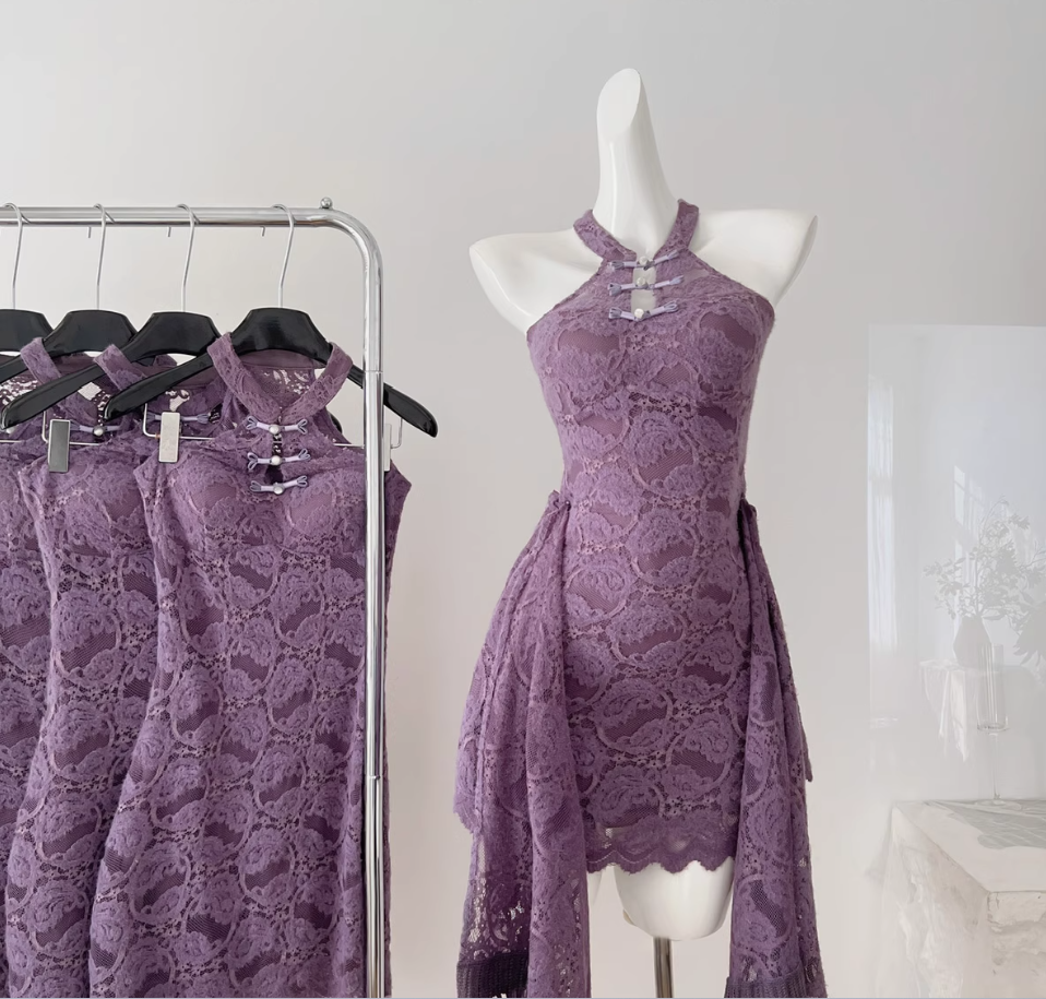 Purple halter neck dress 2025 new style new Chinese style hip skirt lace skirt R2086