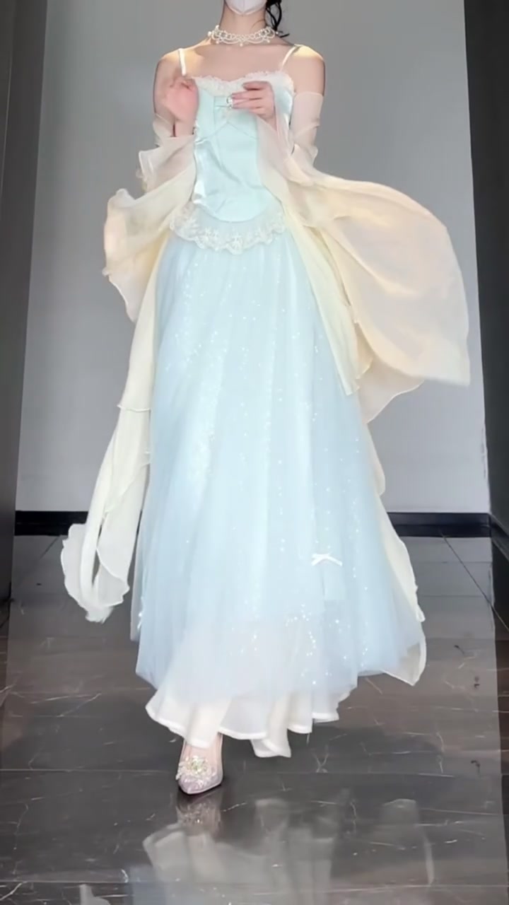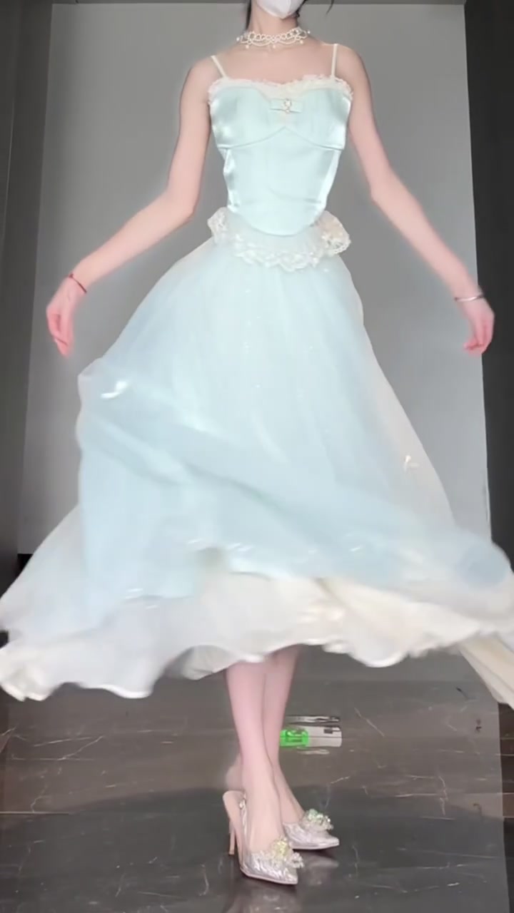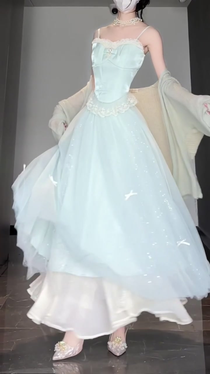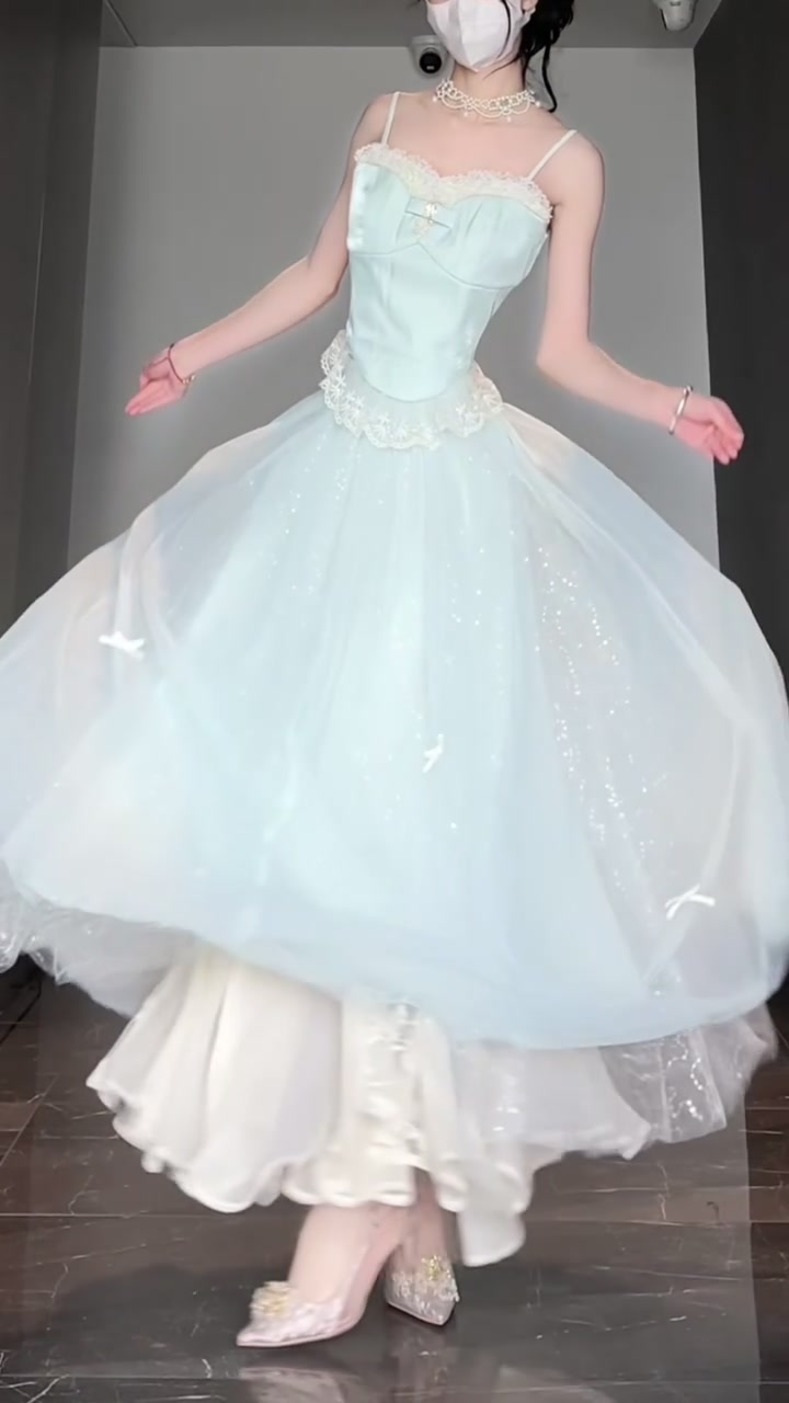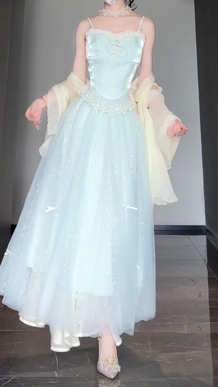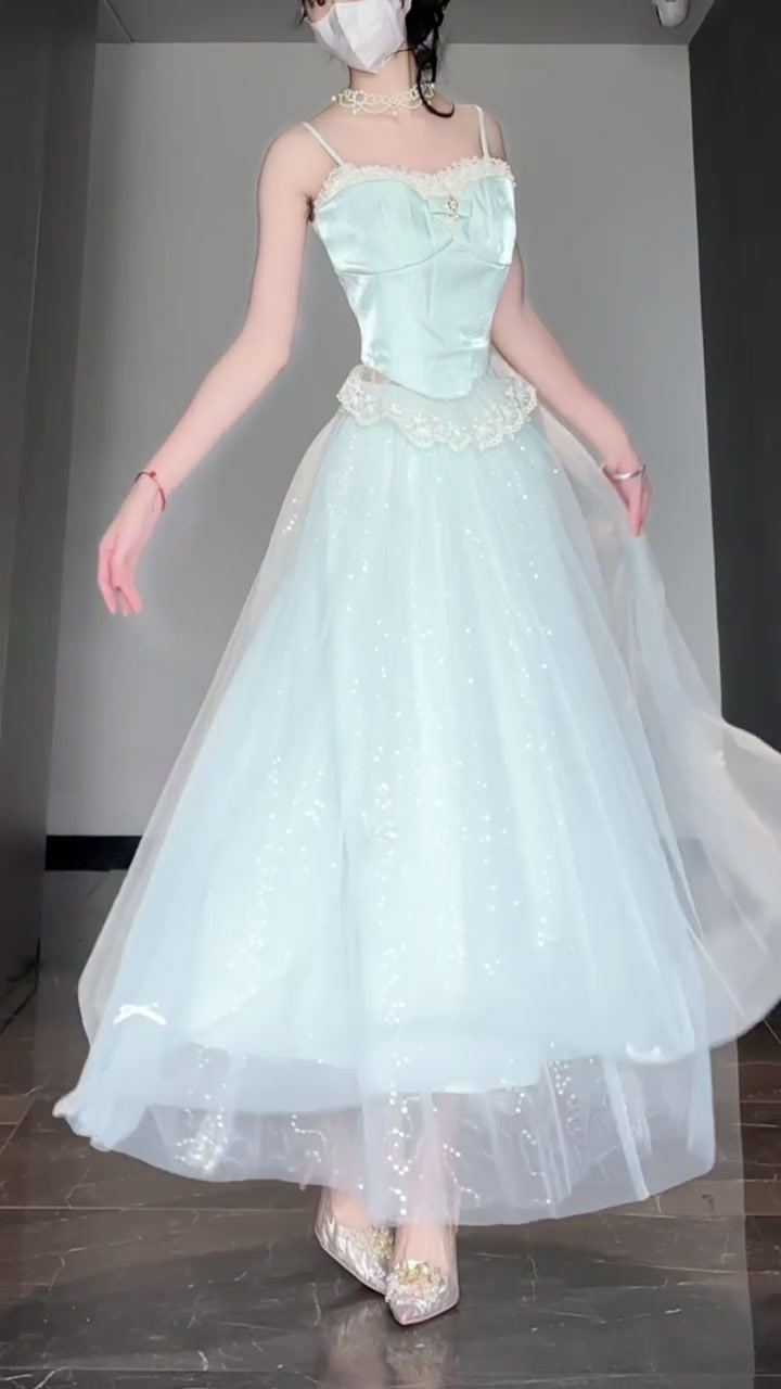 Qianjin Outfit Blue Camisole Vest Mesh Skirt Two-piece Set R0511