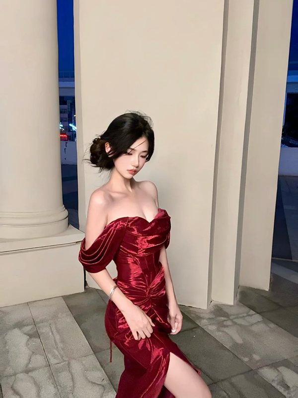 Red off-the-shoulder fitted waist sexy fishtail long ball gown R8131