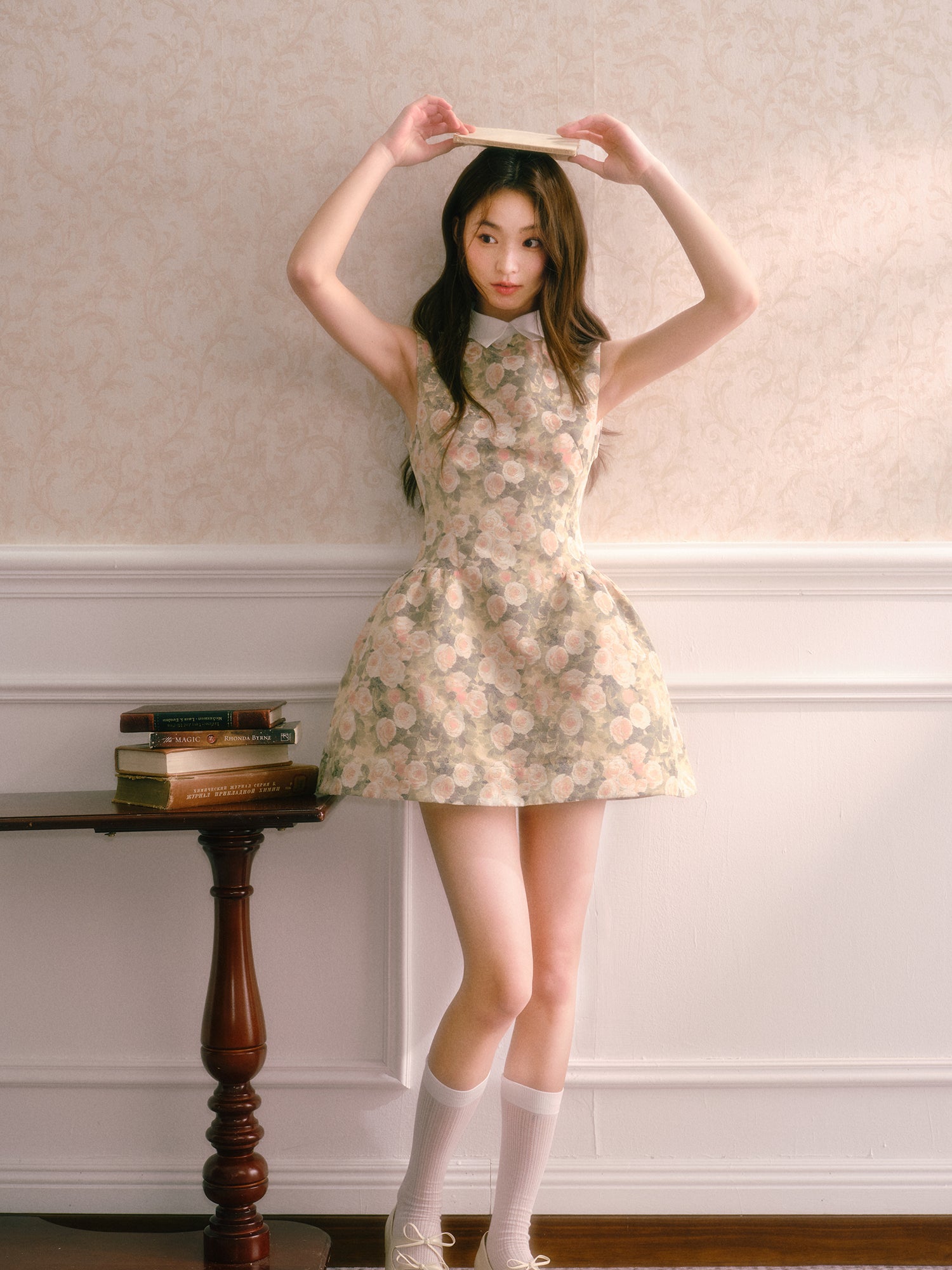 Rose Oil Painting Shirt Collar Sleeveless Dress Qianjinfeng Puffy Slim Waist Vest Dress R5134