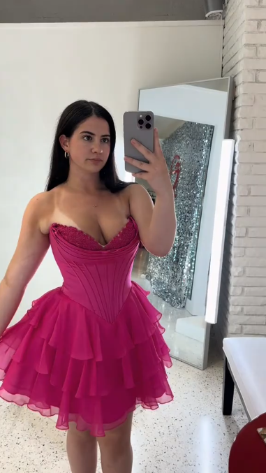 Rose red tube top waist slim cake skirt short skirt homecoming dress R5486