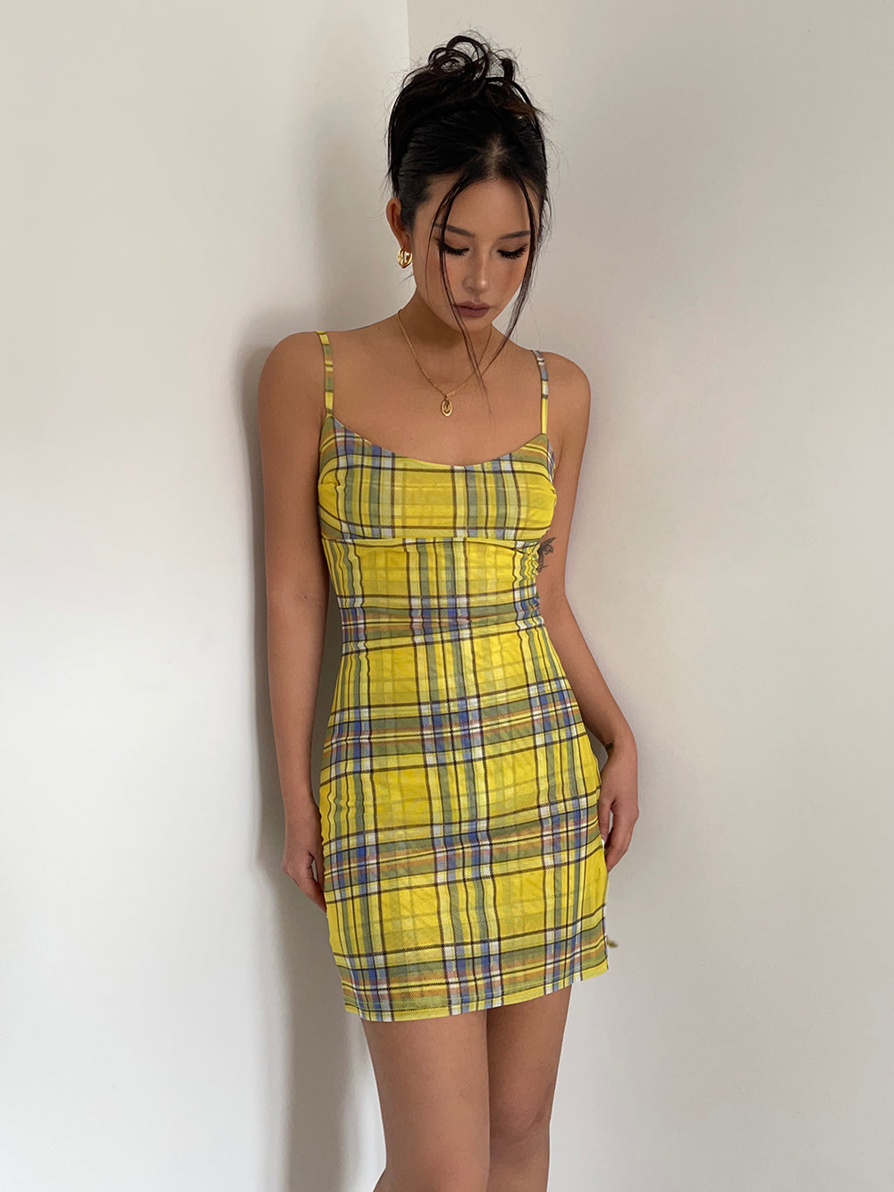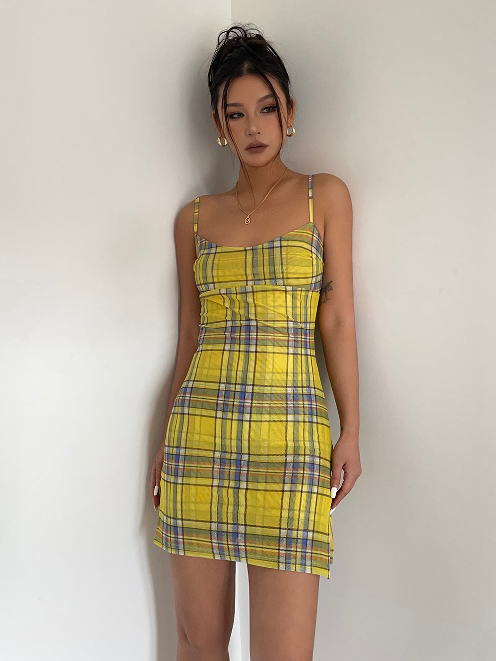Show body American hot girl sexy yellow plaid soft a-line suspender skirt holiday dress R3033