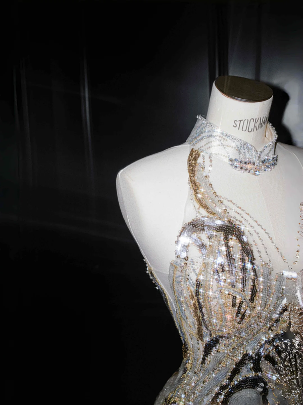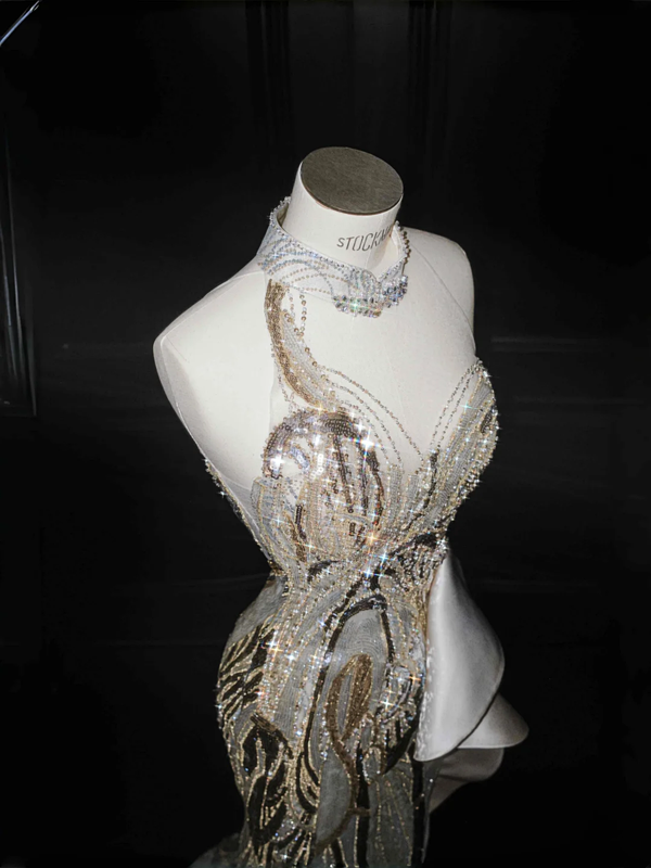 Spliced color one-shoulder sexy sequined waist slim long skirt, prom dress R5679