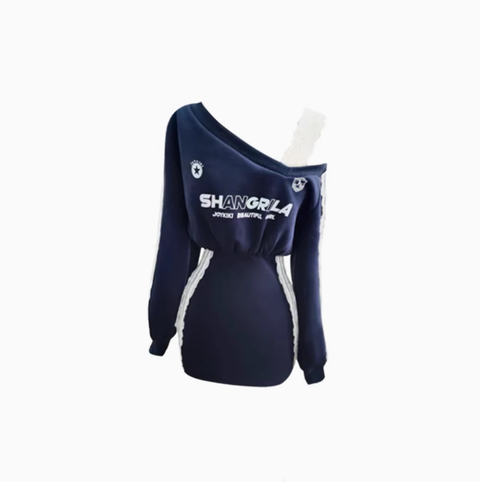 Sports style oblique collar off-shoulder sweater dress 2025 lace patchwork waist hip short skirt R1237