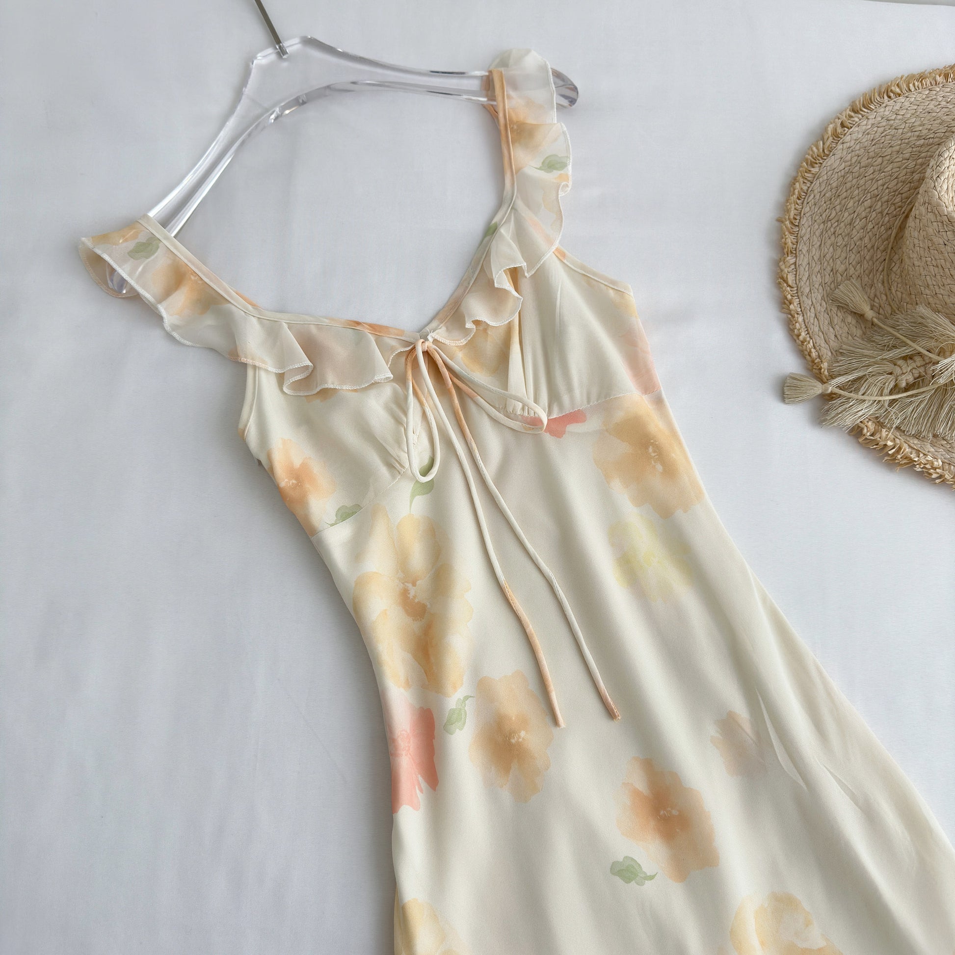 Summer French V-neck floral dress with slim waist and chiffon long skirt R2125