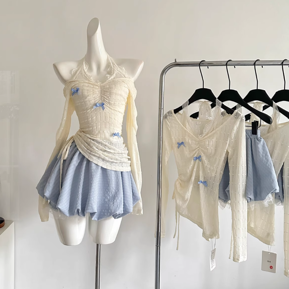 Sweet and slim halter neck fake two-piece top and skirt suit R2000