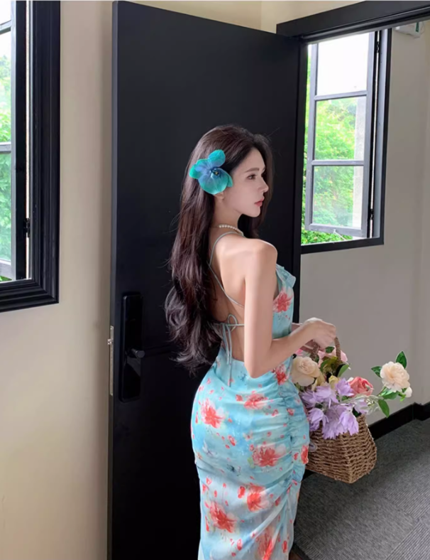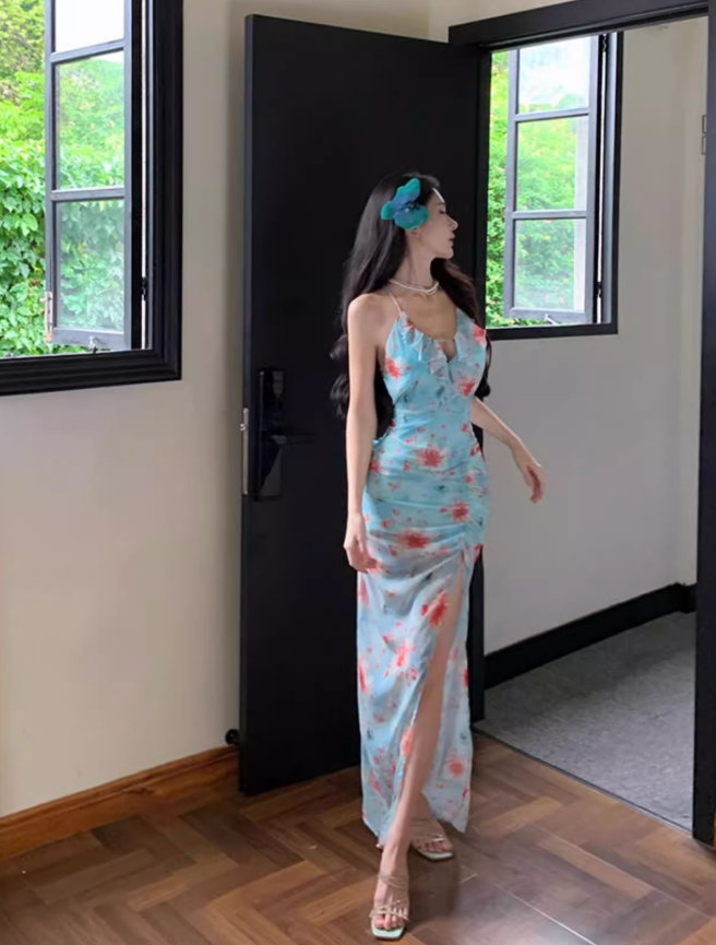 Sweet and spicy high slit slim backless dress beach dress seaside holiday atmosphere dress R1576