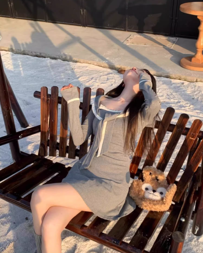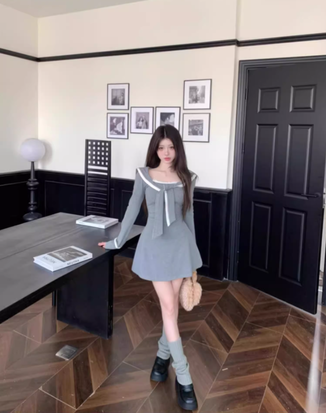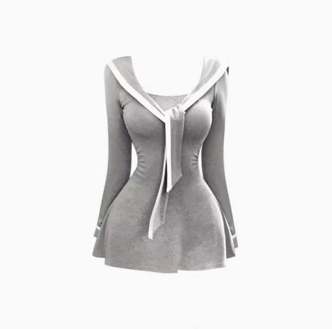 Sweet and spicy navy collar long-sleeved dress 2025 pure desire waist A-line short skirt R1094