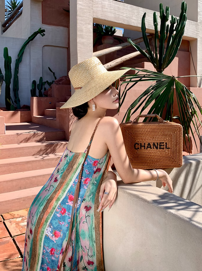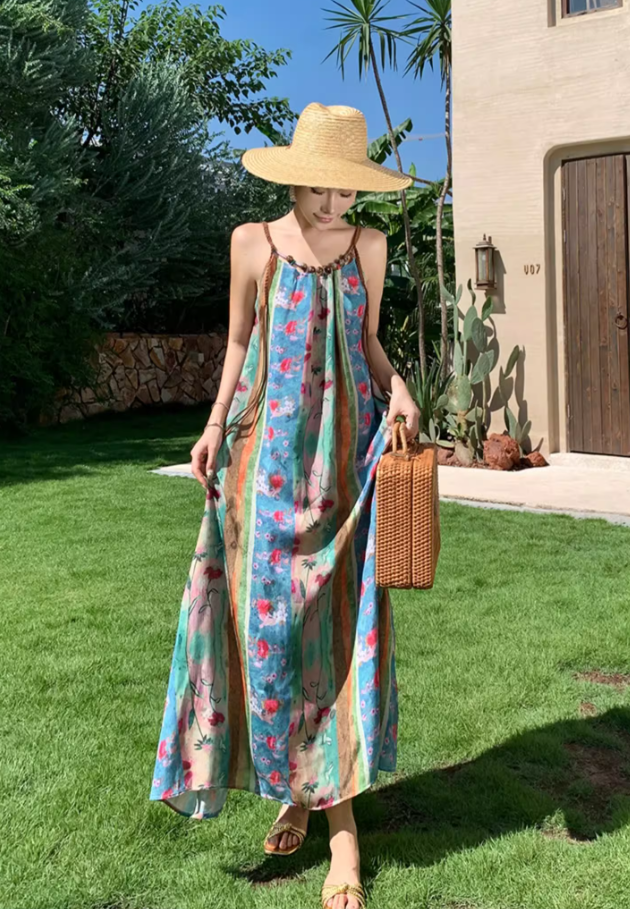 Travel wear beach dress retro travel seaside vacation floral suspender dress R1585