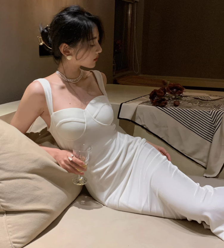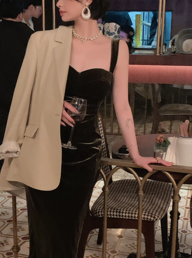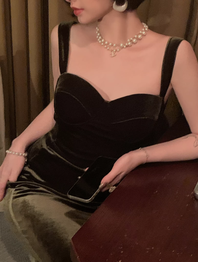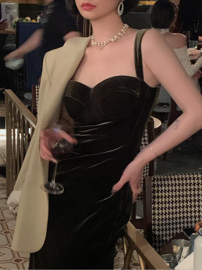 Velvet sling wine red dress retro Hong Kong style French design banquet dress R1436