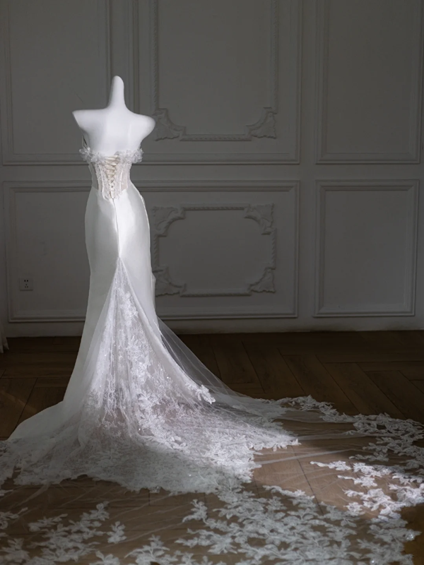 White one-shoulder beaded waist slim satin maxi bridal gown R5782