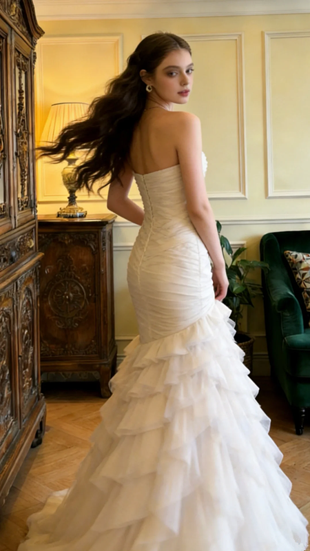 White strapless, fitted waist, long ball gown R8701