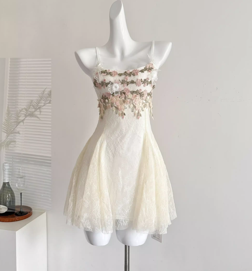 White three-dimensional embroidered flower waist dress pure style skirt R2006